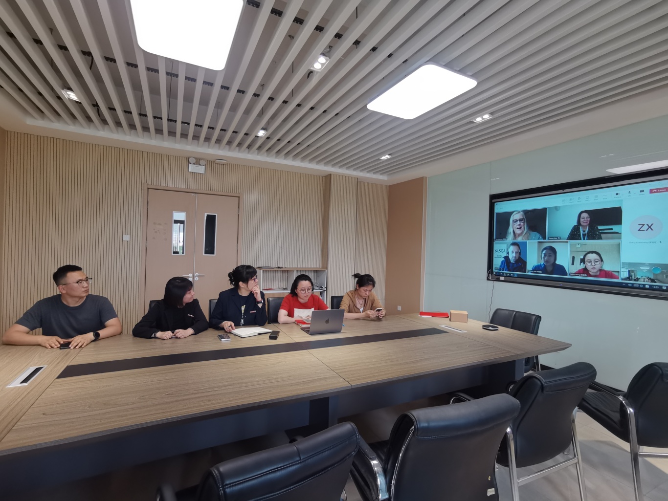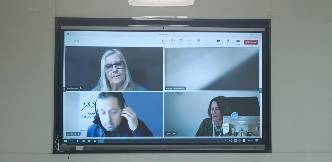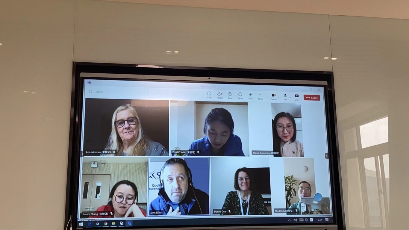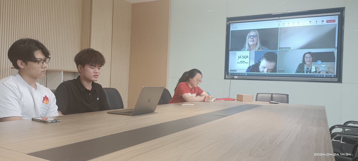 2024年4月24日下午14:30,教育部留学服务中心CSCSE-SQA AD项目2024年度专业认证及课程认证线上反馈会在国际教育学院会议室如期召开。苏格兰学历管理委员会(SQA)评估专家Ann Jakeman、John Elliott、Donna Gray、国际教育学院副院长刘媛媛、SQA项目协调员张溪、任课教师以及相关管理人员参加了本次会议。