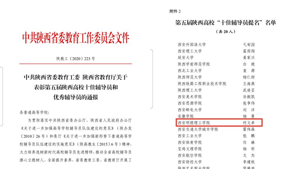 何文举获得第五届陕西省高校 “十佳辅导员提名”荣誉称号