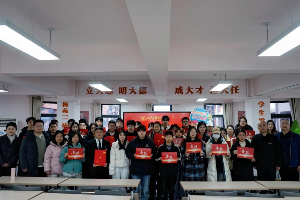 最后,与会老师为奖学金获得者颁发喜报并合影留念,现场气氛热烈,掌声不断。本次活动既是树立典范的盛会,也是一堂富有感染力的思想政治教育课。学生资助管理中心将持续推进资助育人工作走深走实,助力广大学子在成长道路上砥砺奋进、绽放青春光彩。
