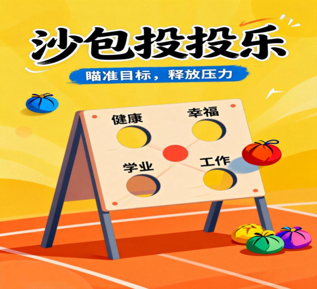活动流程:参与者站在规定的投掷线外,手持沙包。面对写有“健康”“幸福”“学业”“工作”字样且带有洞的KT板。用手将沙包投向KT板上的洞,每个参与者有一定的投掷次数(2次)。