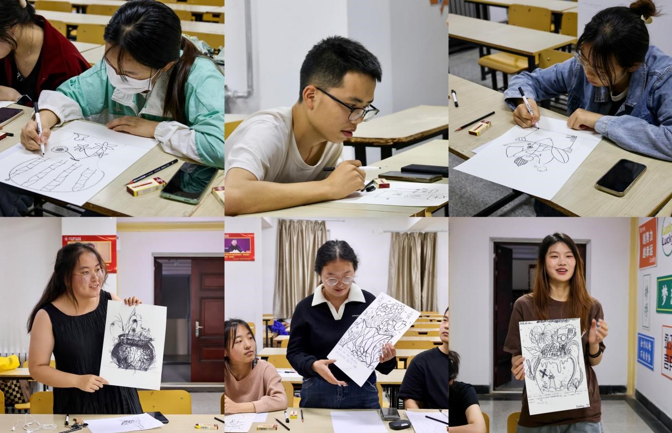 此次活动由艺术与设计学院刘思瑞老师带领开展,活动伊始,刘老师讲解了线描艺术与心理疗愈的关联,并借助格洛丽亚·威尔科克斯博士的情绪轮盘模型,帮助学生创建属于自己的视觉图库。随后,运用声音这一媒介,播放钢琴曲和湍流声引导学生们选用自己的视觉图库将当下情绪以线条的形式尝试表现。最后,以“送给自己的盆栽”为主题,带领学生释放情绪、勾画期望,并鼓励大家分享线描过程中的内心感受,以其独特的视角,引领学生们深入探索线描艺术的魅力。