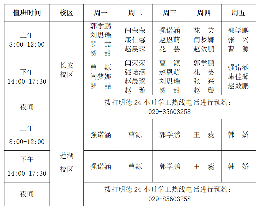 (1)在法定节假日和夜间,大学生心理健康教育中心在长安校区和莲湖校区均安排有值班咨询师,如同学们有咨询需求,可通过网络预约或电话预约(明德24小时学工热线)方式进行预约,值班咨询师可提供线下心理咨询服务。