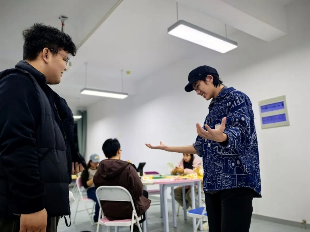 活动以“情绪盲盒”破冰游戏开始,同学们通过相互提问猜测情绪关键词,增进对自我与他人的理解。随后进行面具绘制环节,学生以色彩与线条在面具上表达近期情绪,完成情绪的可视化呈现。