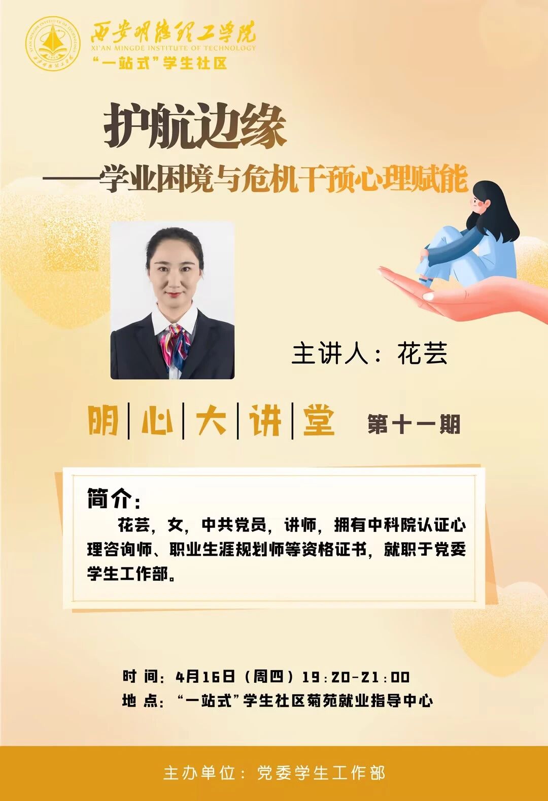 一、培训时间2026年4月16日 19:20二、培训地点“一站式”学生社区菊苑就业指导中心 三、报告会专家党委学生工作部 花芸四、培训对象 艺术与设计学院班级与宿舍心理委员明天我们不见不散~