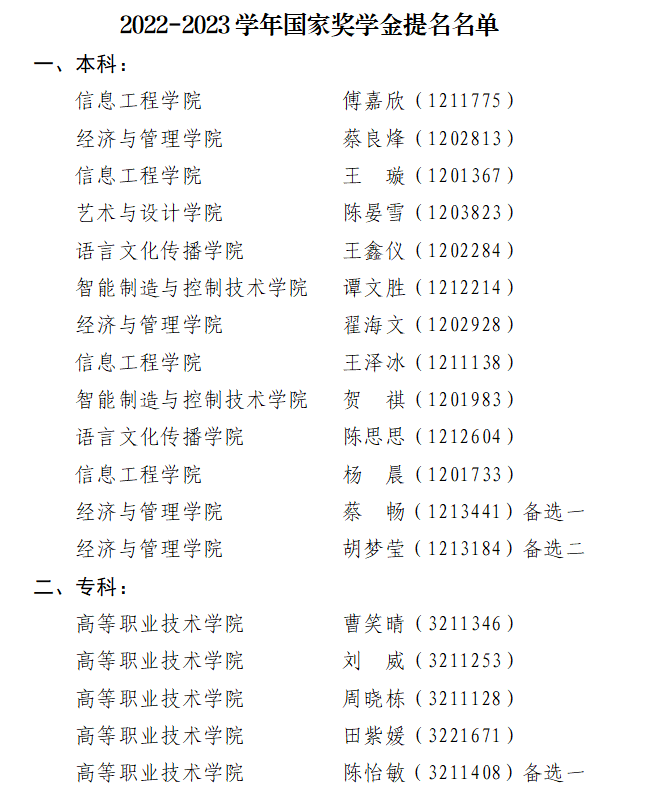 根据陕西省教育厅办公室《关于做好2023年普通高校本专科生国家奖学金工作的通知》陕教办〔2023〕21号文件精神和要求,本着公开、公正、公平、择优的原则,经学生申请、学院初审、国家奖助学金评审工作领导小组复审,由高至低最终确定2022-2023学年国家奖学金候选人提名名单(包含备选名额)。现予以公示。