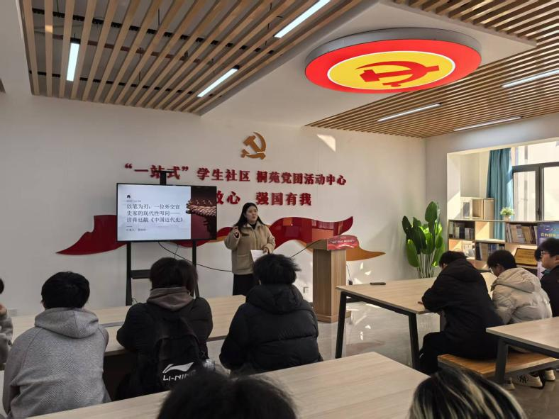 分享会上,景怡欣老师则以《以笔为刃:一位外交官史家的现代性叩问——读蒋廷黻〈中国近代史〉》为主线,从外交史与思想史的双重角度,解读蒋廷黻如何以现实主义笔触重构中国近代史的叙事框架。她剖析了“冲击—反应”模式下的国家命运与知识分子担当,并引导学生思考历史书写与现实关怀之间的关系。景老师指出:“读史不仅是为理解过去,更是为在变动世界中寻找自我的位置与责任。”