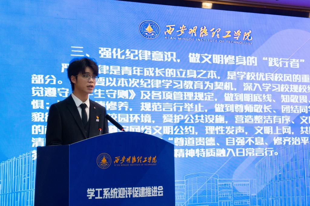 学生干部代表、校学生会主席团成员李旭帆在发言中回顾了过去一年团学组织围绕评估攻坚开展的系列工作,充分展现了明德学生干部的青春担当。他代表全体学生干部承诺,将带头吃透评估要求、带头严守校规校纪、带头配合迎评部署,以实际行动为全体同学立标杆、做示范。