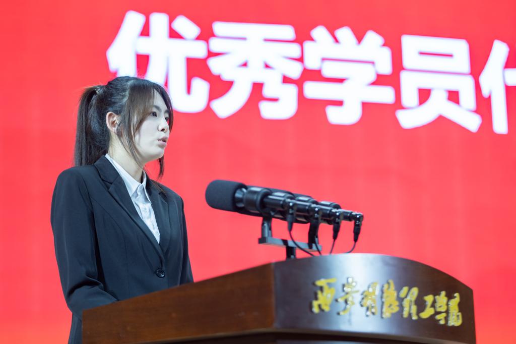 语言文化传播学院冀雅楠同学代表全体党校培训班学员发言,倡议全体学员以党的创新理论为指引,端正入党动机,争做先锋模范,在专业学习、社会实践和志愿服务中彰显青年担当。