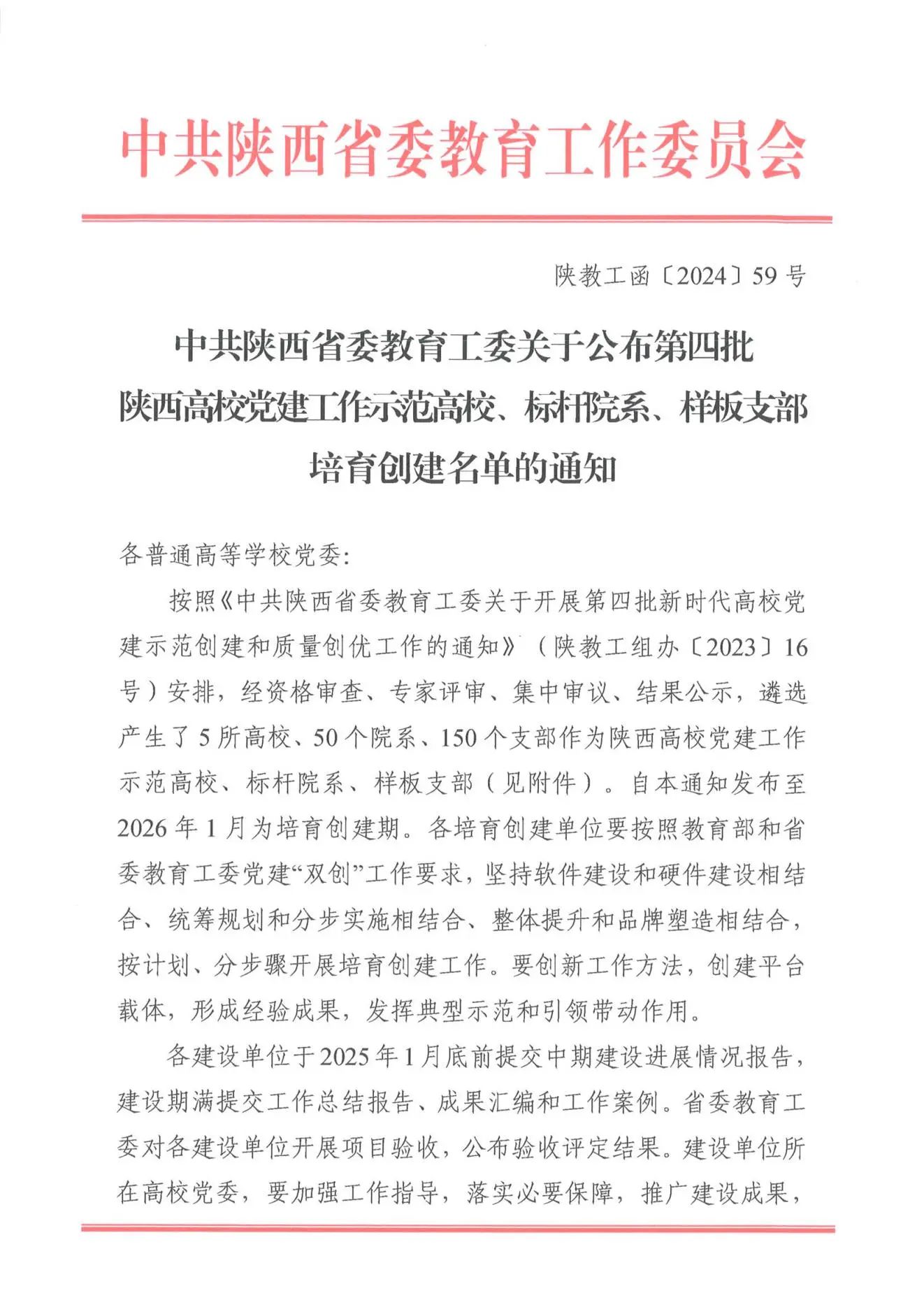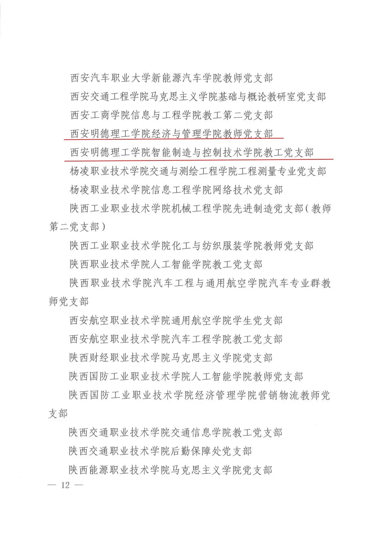 近日,中共陕西省委教育工委公布了第四批陕西高校党建工作示范高校、标杆院系、样板支部培育创建名单,学校经济与管理学院教师党支部、智能制造与控制技术学院教工党支部入选党建工作“样板支部”培育创建单位,这是世界杯官网党建“双创”工作取得的新突破。