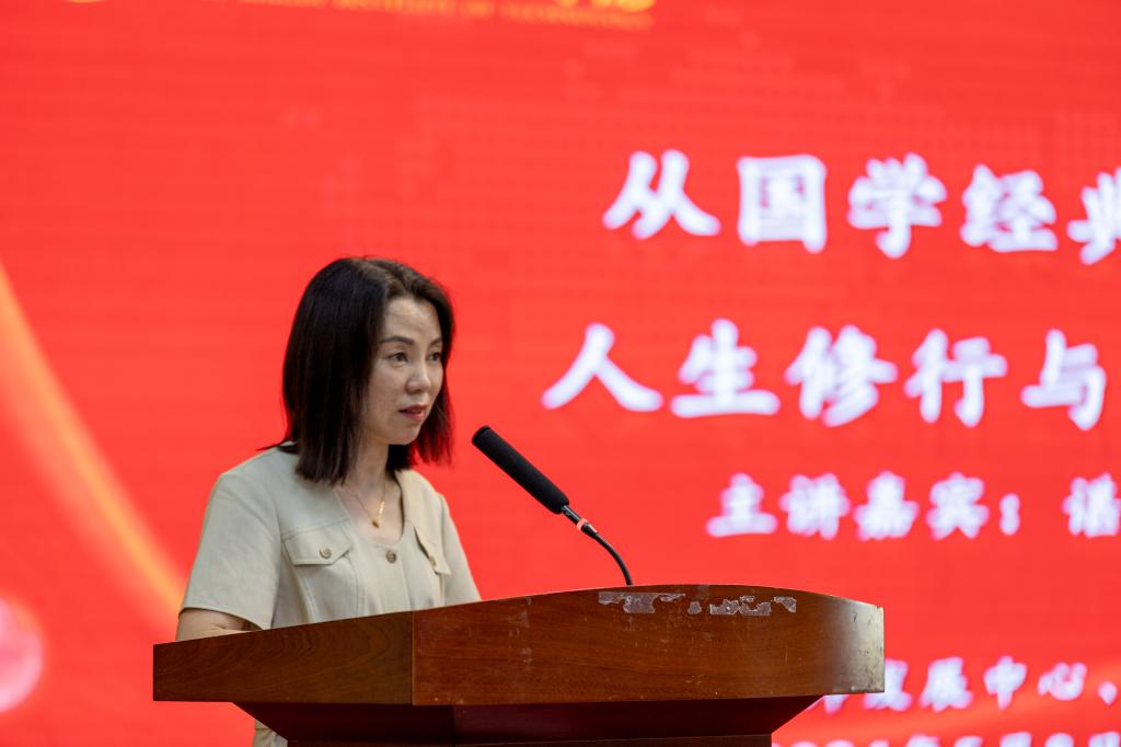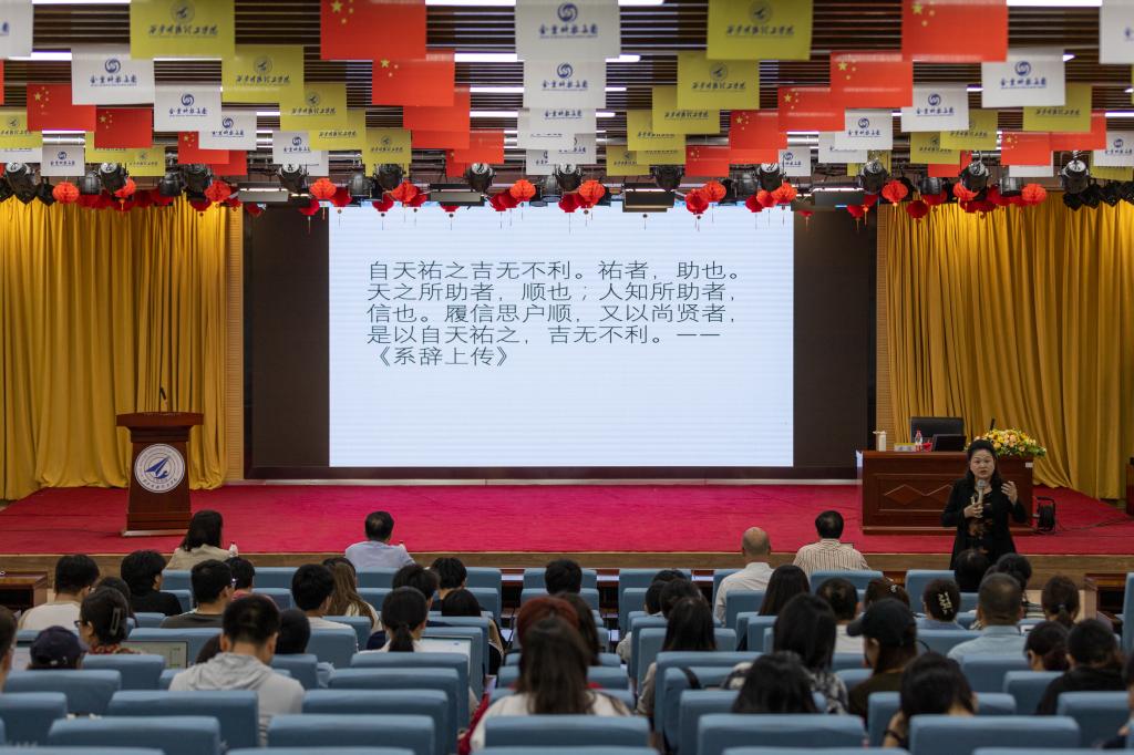 谌仪教授以“从国学经典看人生修行与发展”为主题,她从国学经典《易经》出发,用生动的语言,运用大量国学、心理学、哲学的知识,引经据典,结合自身经历、实践经验和鲜活案例,对人生为什么要修行发展以及如何修行发展进行了细致深入的讲解。其中,她谈到“天行健,君子以自强不息;地势坤,君子以厚德载物”这句《易经》名言蕴含了丰富的人生智慧,它鼓励人们既要积极进取,又要包容厚德,体现了中国古代哲学中对立统一的思想。这句名言对中国社会产生了深远的影响,并至今仍被广泛传颂和学习。