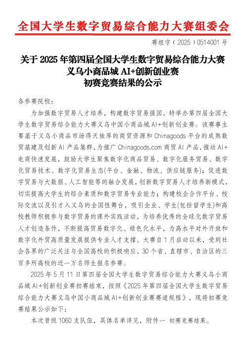 5月14日,第四届全国大学生数字贸易综合能力大赛“义乌小商品城AI +创新创业赛”初赛结果揭晓,经济与管理学院国际经济与贸易专业7支参赛队伍脱颖而出,成功晋级省赛,展现了学院在数字贸易人才培养方面的成效,为学院赢得了荣誉。
