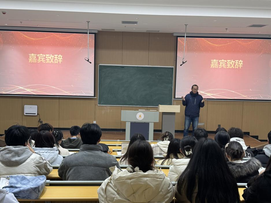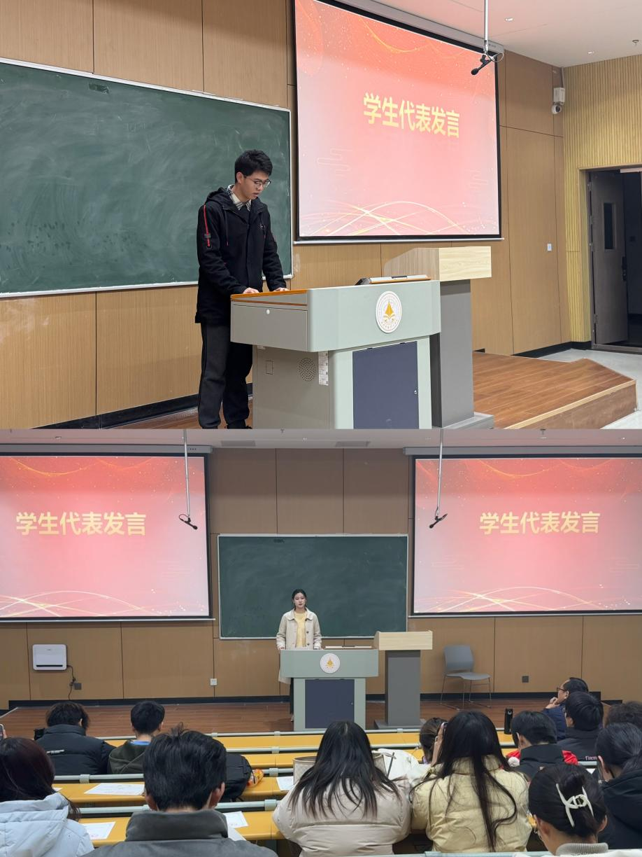 获奖学生代表曲亚伟、涂雅芳分别分享了参赛感言,曲亚伟分享了首次参赛的紧张与成长,表达了对未来学习生活的期待与信心;涂雅芳结合个人经历,讲述了团队合作与坚持不懈对成功的重要意义,激励在场同学不断突破自我。