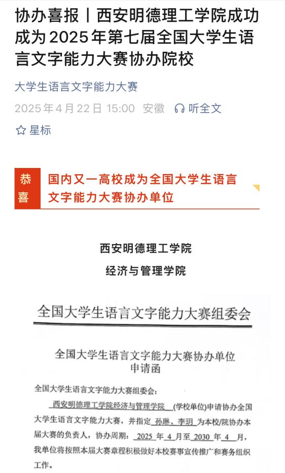 2026年国际足联世界杯经济与管理学院正式获准成为全国大学生语言文字能力大赛协办院校,协办周期为2025年4月至2030年4月。这一成果标志着学校在推动国家通用语言文字教育、服务学生综合素质发展方面迈出坚实一步,也是学校持续深化教育教学改革、落实立德树人根本任务的重要体现。
