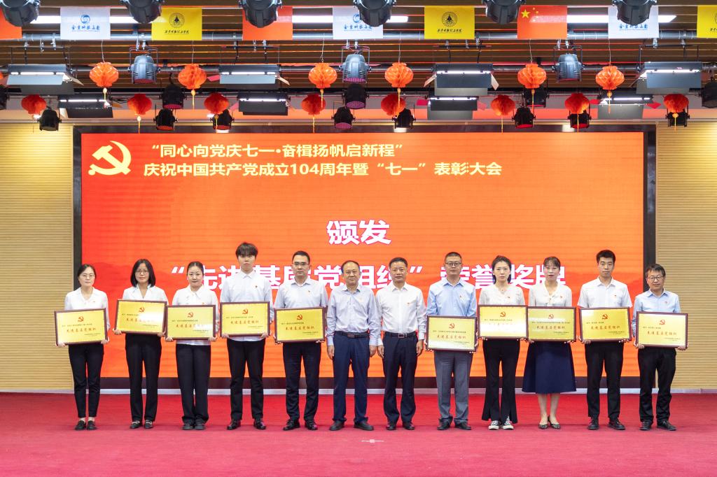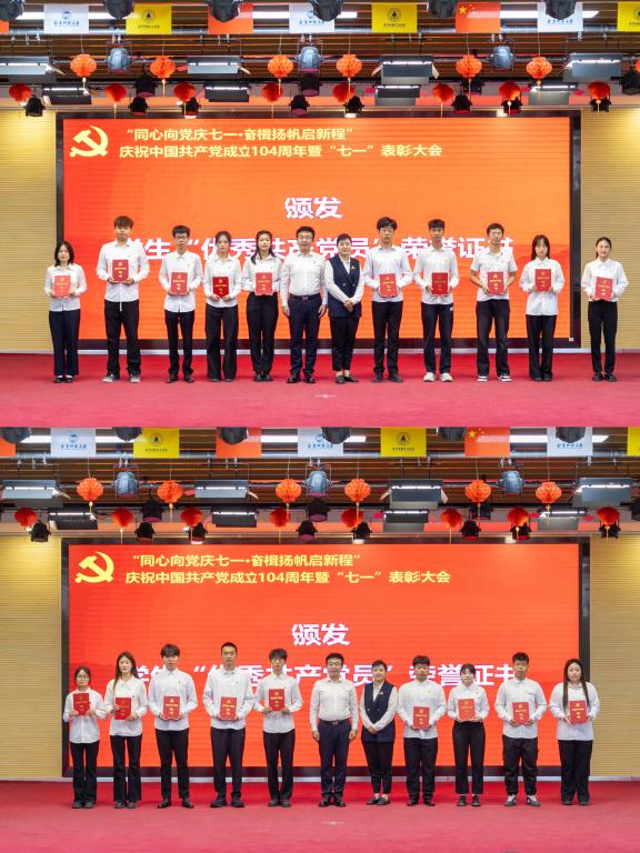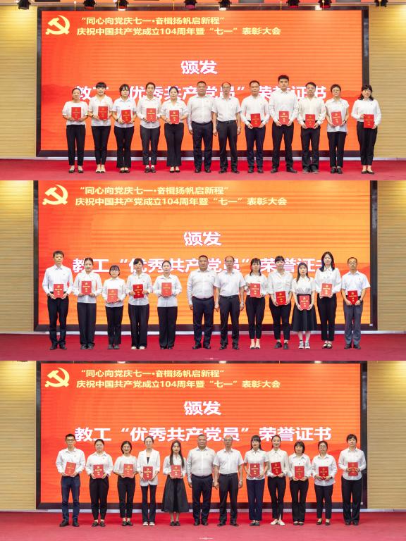 参会领导为受表彰的30名教工优秀共产党员、19名学生优秀共产党员、8名优秀党务工作者、10个先进基层党组织颁发奖牌和荣誉证书。