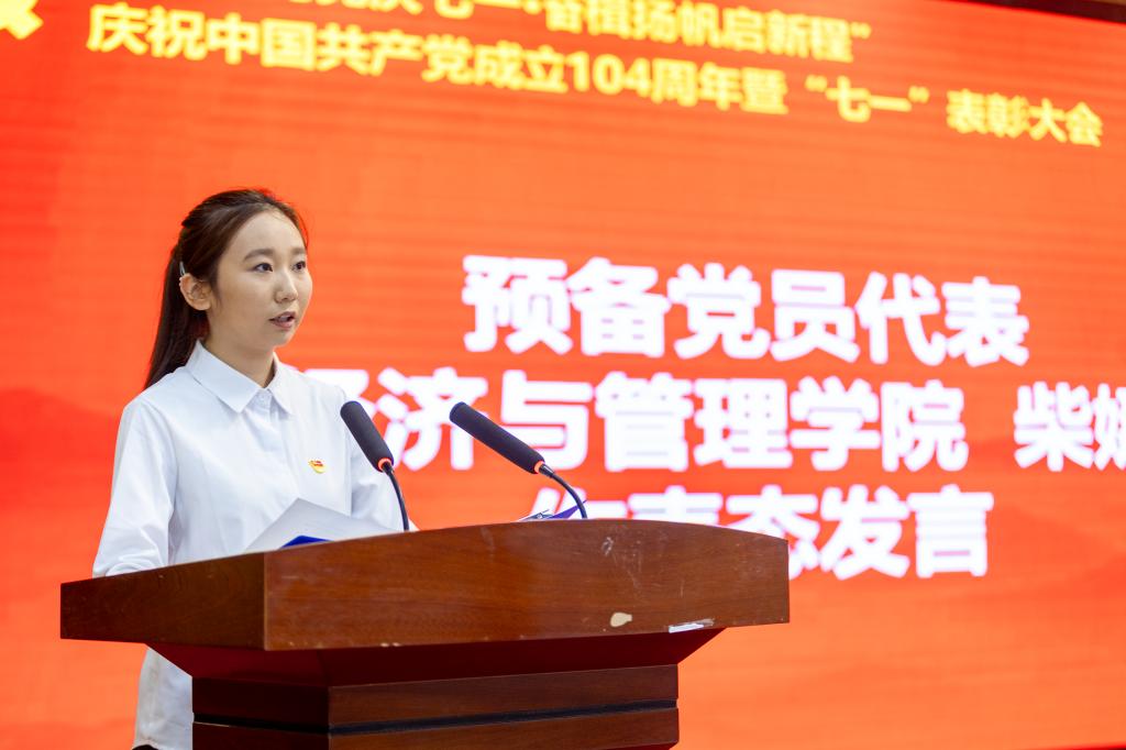 语言文化传播学院徐微作为教工优秀共产党员代表发言,她回望了自己近30年党龄和教龄的岁月,深情讲述了坚守为党育人、为国育才的初心使命,践行用外语讲好中国共产党和中国故事的光辉过往。信息工程学院熊丽丽作为学生优秀共产党员代表发言,分享了自己从参军入伍到退役复学的成长经历以及对“党员”二字的理解与感悟。经济与管理学院柴娜同学代表全体预备党员郑重承诺,将持续强化理论武装,锤炼过硬作风,勇担评估责任,切实把个人追求融入党和人民的事业之中。