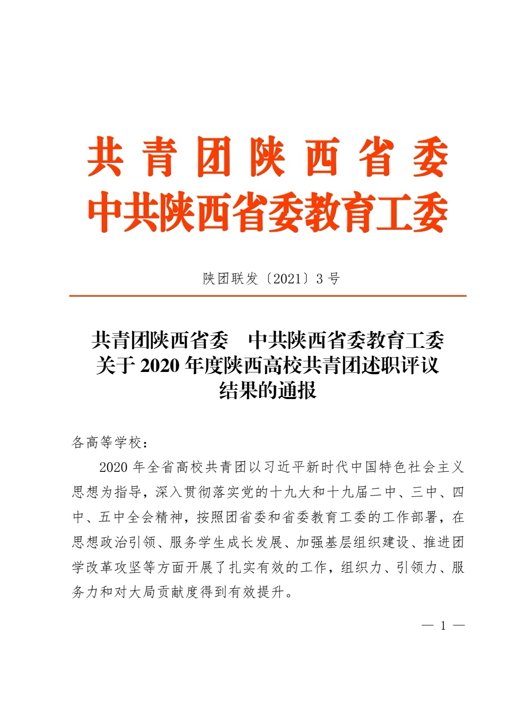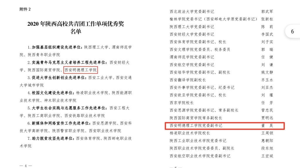 近日,团省委、省委教育工委联合通报了《2020年度陕西高校共青团述职评议结果》,学校团委获得2020年度陕西省高校共青团工作实施青年马克思主义者培养工程“先进单位”称号,同时学校党委副书记董昊同志被评为“2020年度陕西高校支持共青团工作好书记”。