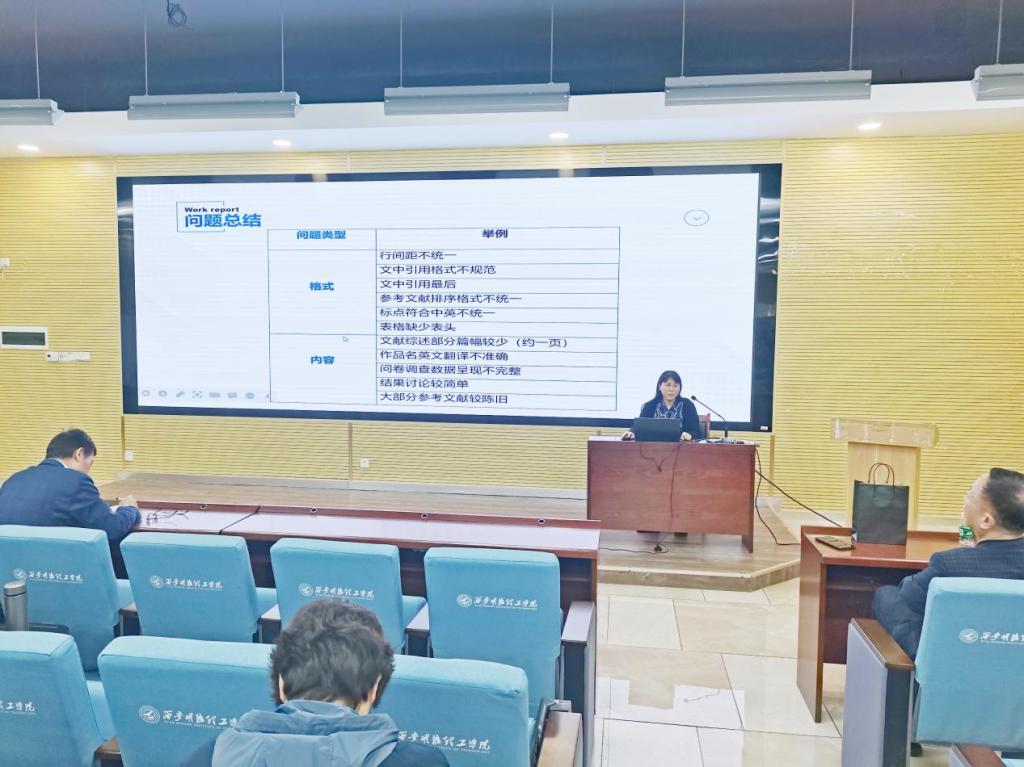 李云平副教授、曹明教授、马桂花教授对试卷及毕业论文抽查问题中的共性问题和个性问题都进行了细致的反馈,并给出合理的建议。她们指出应规范试卷批改的条例流程,规范论文指导的条例流程,实行奖惩制度。此外,学院需统一对教师进行试卷批改的培训,使教师熟悉、知晓规章制度、规范条例等;提前对指导教师进行论文指导及评阅的培训,使教师熟悉、知晓论文格式等方方面面。英语专业负责人柴芸对试卷及毕业论文抽查问题进行汇报,希望英语专业老师认真对待试卷评阅和论文指导,同时要求试卷审核人能切实起到审查的作用。大学英语课程负责人史晓亮结合大学英语试卷自查过程中反馈的问题,提出了大学英语试卷的整改方案。