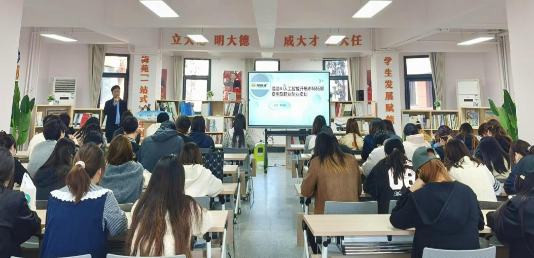 董宝堂以“借助AI人工智能开展市场拓展案例及职业创业规划”为题,从“就业寒冬:我们面临的挑战”、“AI冲击:传统岗位的危机”、“破局之路:新赛道与新机遇”、“行动指南:拥抱AI,赋能未来”四个方面进行了讲解,并结合自身成长创业经历,阐释了时代变迁对个人职业生涯规划的影响。他向青年学子分享了个人创业成功的经验:一是要顺应时代潮流,善于站在时代风口;二是要有资源托举,能为创业提供坚实支撑;三是要敢拼敢闯敢干,有直面市场的勇气与智慧。互动环节,同学们踊跃提问,董宝堂逐一做了细致解答。现场气氛热烈融洽。