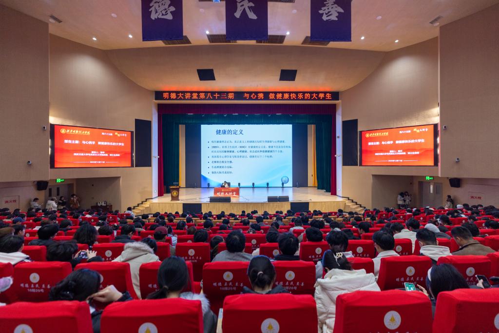 为深入贯彻落实心理健康教育工作要求,助力学生健全人格养成与身心健康发展,2025年12月11日晚上七点,第83期“明德大讲堂”在四季廊桥报告厅举行。本次讲座邀请到了西安交通大学杨华教授,全校1000余名师生通过线上线下结合的方式参与,共同探寻心理成长的奥秘。本场讲座由惠斌副院长主持。