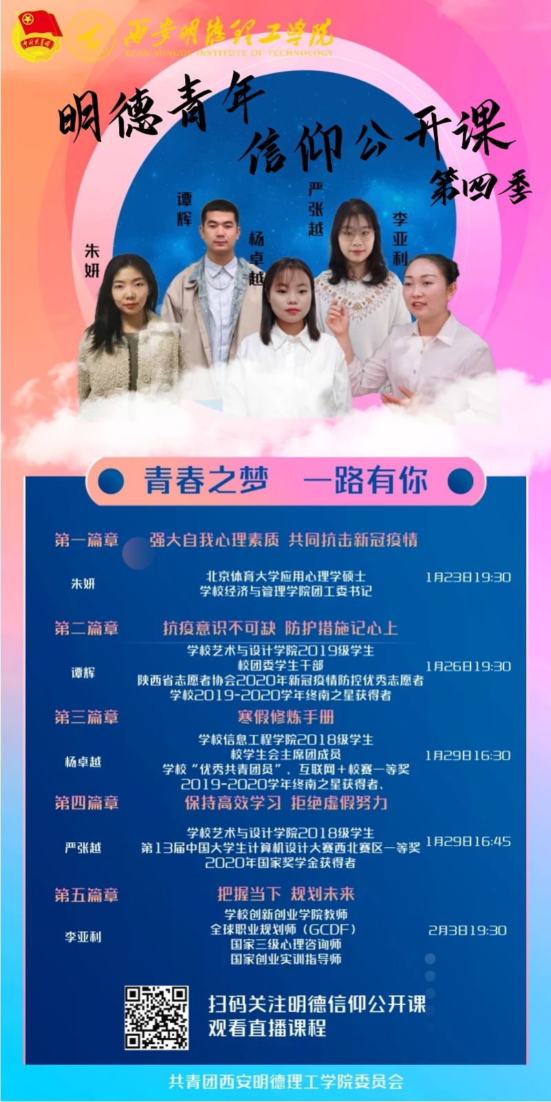 “用身边的人讲述身边的事,用身边的事教育身边的人”。“信仰公开课”创新团课形式,讲好青春奋斗故事。宣讲人中有以德润心、德才兼备的全国高校百名研究生党员标兵;有帮助学生疏导情绪、调整心态的心理辅导团队;有受到2020年陕西省志愿者协会表彰的优秀年度抗疫志愿者;有敢于挑战自我、创新创业导师;有以身作则、敢为有为的青年学生干部。他们从心理援助、创业就业、职业规划、志愿服务、团学生活等多个方面开讲,用自己的青春奋斗故事,引导广大学生树立正确的奋斗目标,鼓励学生“敢于有梦、勇于追梦、勤于圆梦”,为青年学生充实假期学生生活奉献了精彩一课。