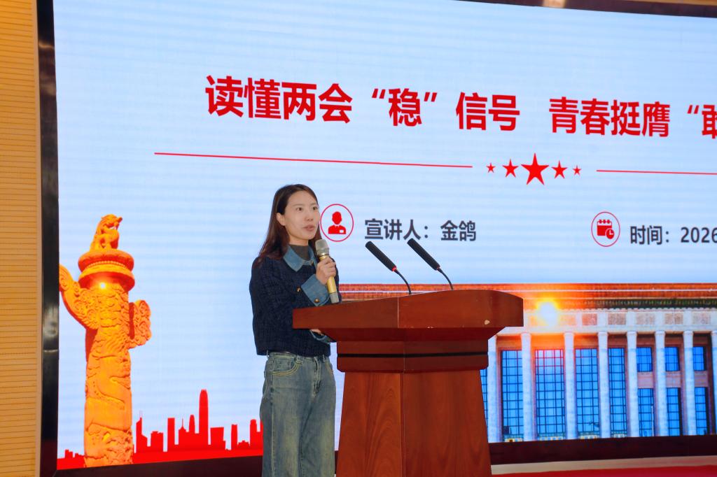 金鸽老师以《读懂两会“稳”信号,青春挺膺“敢”担当》为题,深入分析了在当前世界近80年来最严峻的动荡周期下,中国顶住内外部压力、实现稳中有进的难能可贵,阐释了“中国之稳”作为定海神针的深刻价值。紧扣政府工作报告,系统解读了国家在稳增长、稳创新、稳民生、稳安全四大方面的核心部署与务实举措。最后,她号召青年学子要坚定信念、扎根实践、勇于创新、守牢底线,将个人的青春行动融入国家稳定与发展的大局,共同筑牢美好生活的基础。