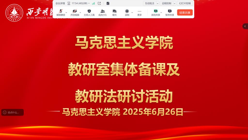 此次线上教研室集体备课及教研法研讨课程总结大会的顺利开展,为马克思主义学院的教师们搭建了良好的交流平台,促进了教学经验的共享与教学方法的创新。通过集体的智慧与力量,有望进一步提升思政课程的教学质量,推动学院思政教育教学工作迈向新的台阶,为培养具有坚定理想信念、深厚家国情怀的新时代人才奠定坚实基础。