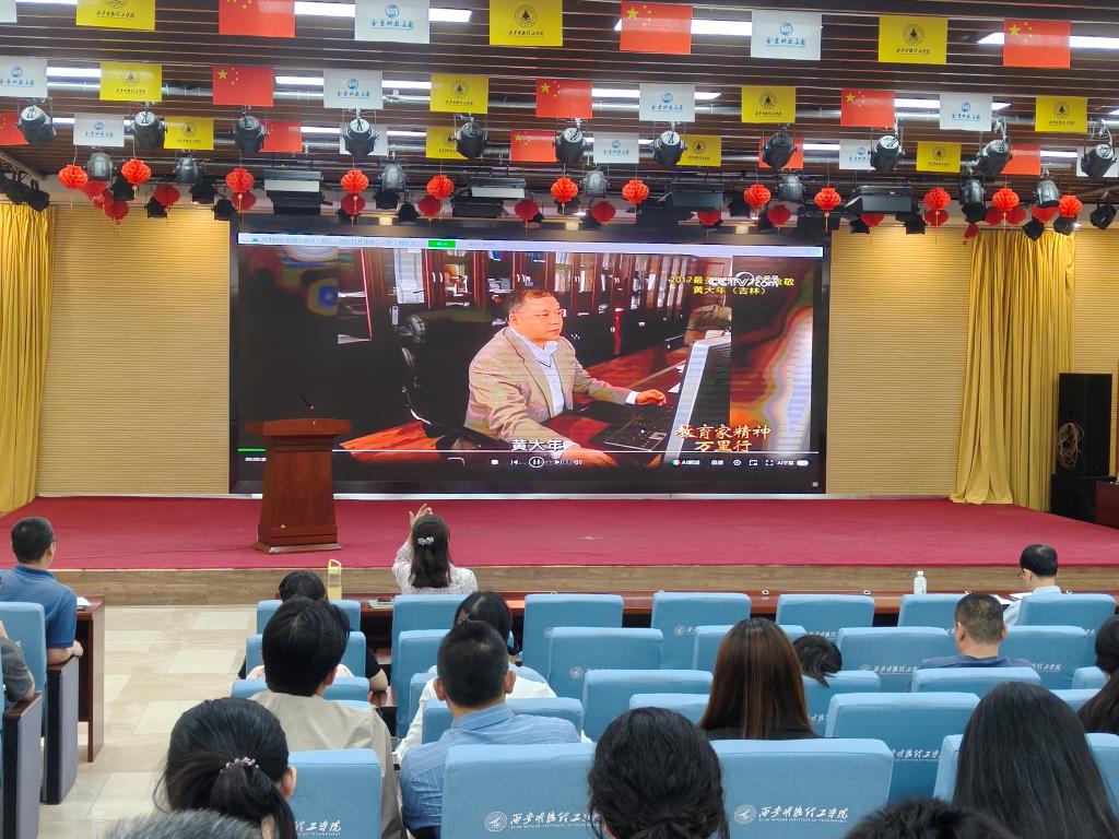 接着,全体教职工观看了优秀教师黄大年先进事迹影视片。黄大年教授的感人事迹深深感染了在场的每一个人,他那心有大我、至诚报国,教书育人、敢为人先,淡泊名利、甘于奉献的精神,成为全体教师学习的楷模,激励着大家在教育岗位上默默耕耘、无私奉献。
