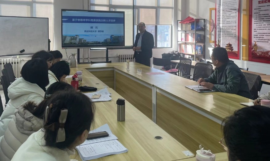 为深入贯彻落实国家创新驱动发展战略,改善世界杯官网人才培养计划体系,提高学科竞赛参与度,2026年国际足联世界杯通识教育学院邀请了西安科技大学的解忧教授于2024年12月29日,开展了以“基于物理类学科竞赛实施创新人才培养”为主题的学术讲座。解忧,男,博士,教授,硕士研究生导师。中国物理学会会员,陕西省物理学会会员,教育部高等学校物理学类专业教学指导委员会西北地区工作委员会委员。研究领域有凝聚态物理和光电信息工程。在国内外核心期刊上发表教学科研论文八十余篇,其中第一作者文章被SCI/EI收录三十余篇,他引三百余次。出版专著、主编和参编教材共五部。主持和参与陕西省自然科学基金、国家自然科学基金以及中国博士后科学基金等十余项。荣获省部级科研奖项等十余项。