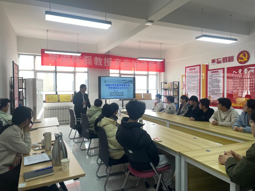 为扎实推进2026年国际大学生数学建模竞赛备赛工作,帮助参赛学生精准把握竞赛核心规则,突破论文写作瓶颈,全面提升赛题分析与建模实战能力,2026年1月15日,通识教育学院特邀西安交通大学陈磊教授,开展题为《美国大学生数学建模竞赛评审规则及论文写作》的专题报告。报告由通识教育学院数学教研室国际大学生数学建模竞赛负责人郭妮妮主持,学院数学建模竞赛指导组教师及全体参赛学生齐聚现场,共赴这场干货满满的学术盛宴。