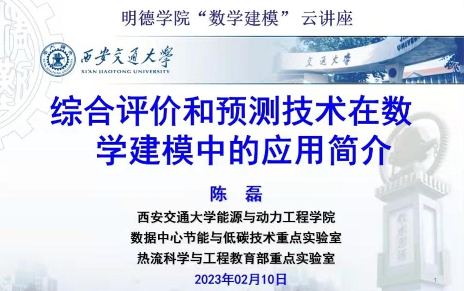 为更好地备战2023年美国大学生数学建模竞赛,全面提升世界杯官网参赛学生的赛题分析能力与建模能力。2月10日通识教育学院特邀西安交通大学能源与动力工程学院陈磊教授作了题为《综合评价和预测技术在数学建模中的应用简介》的专题报告。本次专题报告正值寒假期间,故采用腾讯会议方式进行。报告由通识教育学院副院长郑薇主持,数学建模竞赛指导组教师以及全体参赛学生参加了此次报告。