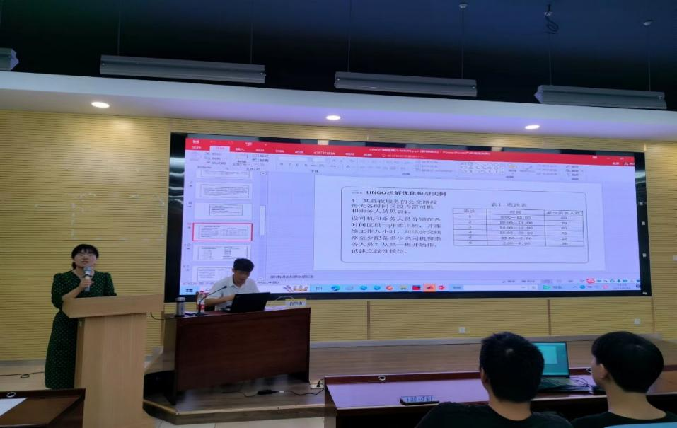 报告中,肖教授首先讲述了优化模型与LINGO编程简介与实例部分。肖教授先以简单线性规划求解、整数规划求解、0-1规划求解、非线性规划求解、指派问题的模型为例,简单翻译直接写成LINGO编程代码,浅显易懂。接着详细介绍了LINGO编写格式和内部调用函数和集合函数。其中重点介绍了常用的“for”和“sum”函数等。最后给出了三个实例,由简入深,逐步求解,学生全神贯注,听得津津有味,受益匪浅。