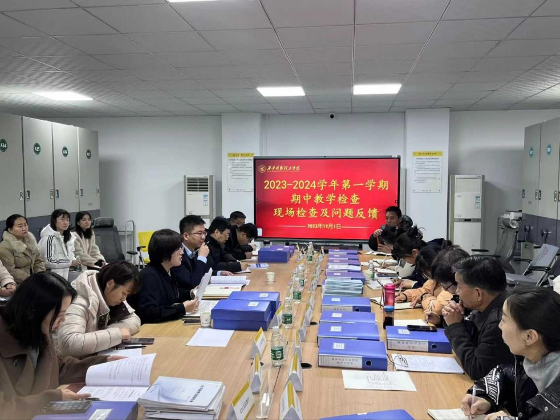 检查组成员在听取了学院教学情况汇报后,以《2023-2024 学年第一学期期中教学专项检查工作指标体系》和《2023-2024学年第一学期期中教学检查随机抽检清单教案抽检清单》为依据,通过“查、看、评”等形式,对教风学风建设、教学质量建设、规章制度建设、实验室建设等教学常规项目进行了全方位、多角度的检查,在肯定学院相关工作的同时,也对存在问题进行了梳理归类和细致反馈,并提出可行性整改建议。