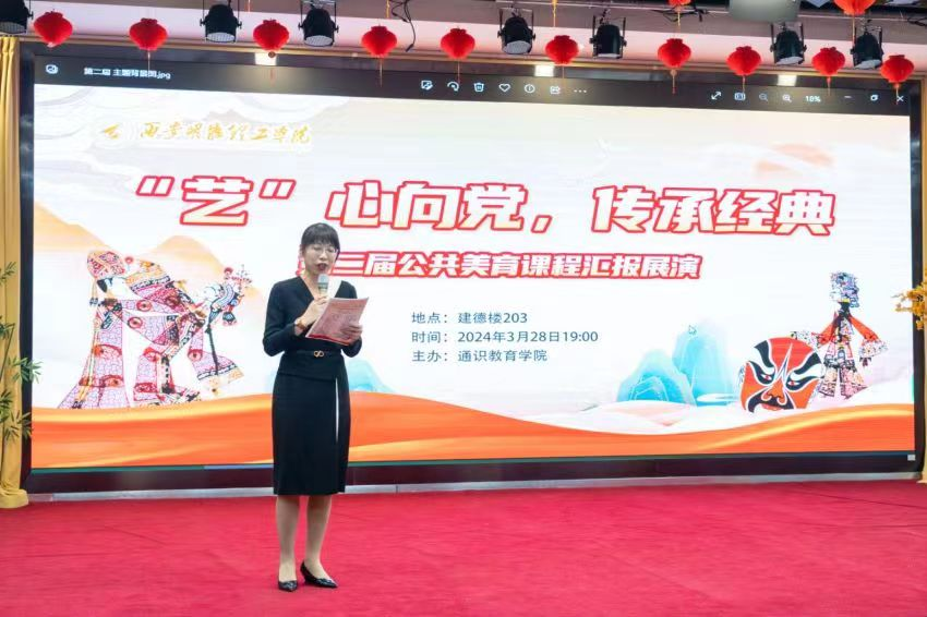 通识教育学院副院长郑薇在晚会开始之前致辞,她指出“人的全面发展”的重要性以及美育在其中的突出作用,明确了公共美育课程的建设目标和方向,总结肯定了公共美育的工作和成绩,指出美育在学校评建工作和高质量转型发展中发挥着重要作用。