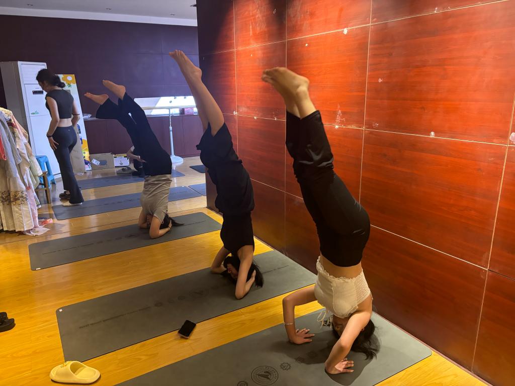 中午12点30分,随着舒缓的背景音乐响起,数十名瑜伽爱好者手持瑜伽垫,迅速在1号实训楼中华优秀传统文化实践基地内集结。在瑜伽教练祝新蕊老师的带领下,参与师生通过简单的呼吸练习和基础体式,感受身体与心灵的放松。短短30分钟内,实践基地化为宁静的瑜伽空间,师生们共同完成了“树式”“猫牛式”等系列动作,现场氛围轻松而专注。