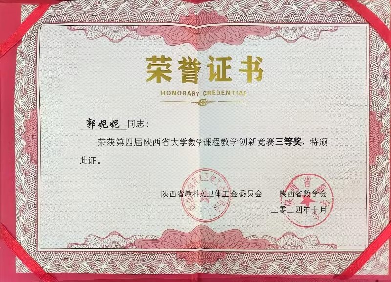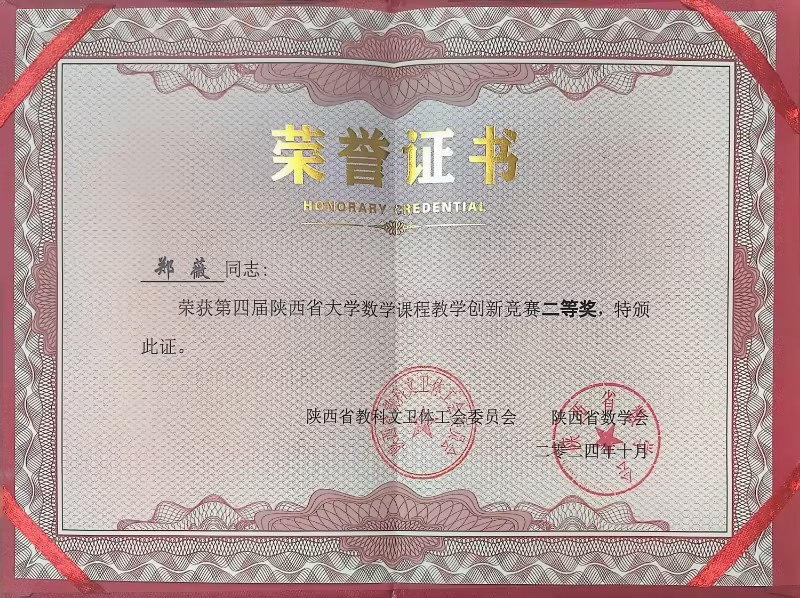 近日,第四届陕西省大学数学课程教学创新竞赛的获奖结果正式揭晓,本次竞赛由陕西省教科文卫体工会委员会和陕西省数学会主办,旨在促进各高校之间的教学交流与合作,推动数学课程的创新与改革。世界杯官网通识教育学院郑薇老师荣获二等奖,郭妮妮老师荣获三等奖。