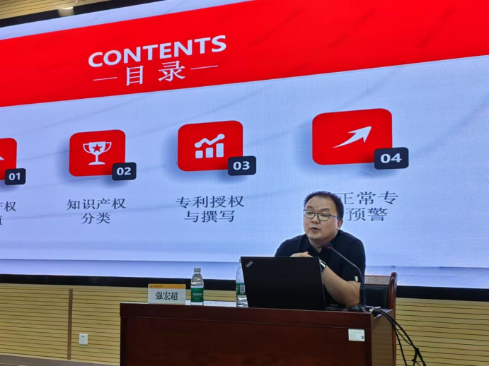 强宏超老师凭借丰富的实务经验,结合大量实例,从知识产权价值、知识产权分类、专利授权与撰写、非正常专利预警四个维度展开深入讲解。他首先阐述了知识产权在科技创新和成果转化中的核心价值;随后系统介绍了专利、商标、著作权等不同类型知识产权的特点及保护策略。在专利撰写环节,强宏超重点讲解了技术交底书的准备要点、权利要求书的撰写技巧等实用内容,并针对高校科研特点,结合实际案例,分享了专利挖掘的有效方法。最后,他就非正常专利申请的认定标准、预警机制及防范措施进行了详细解读,提醒师生要注重科研诚信,避免因不当申请行为影响个人和学校的声誉。