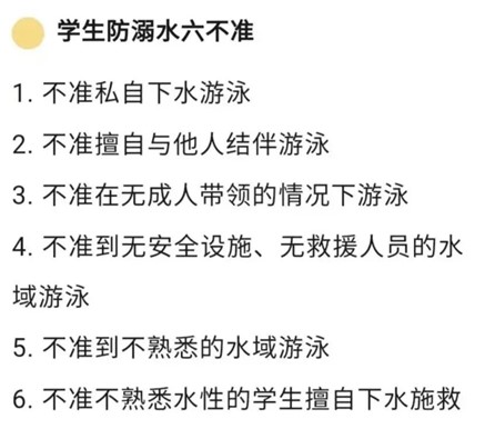 2.慎重选择游泳场所。水中有暗流、漩涡、淤泥、乱石和水草较多的水域不宜作为游泳的场所。不私自下水游泳,不到无安全设施、无救援人员的水域游泳,不到不熟悉的水域游泳。发现同伴溺水,立即寻求他人帮助,或打110、120电话报警求助,不盲目手拉手或下水施救。