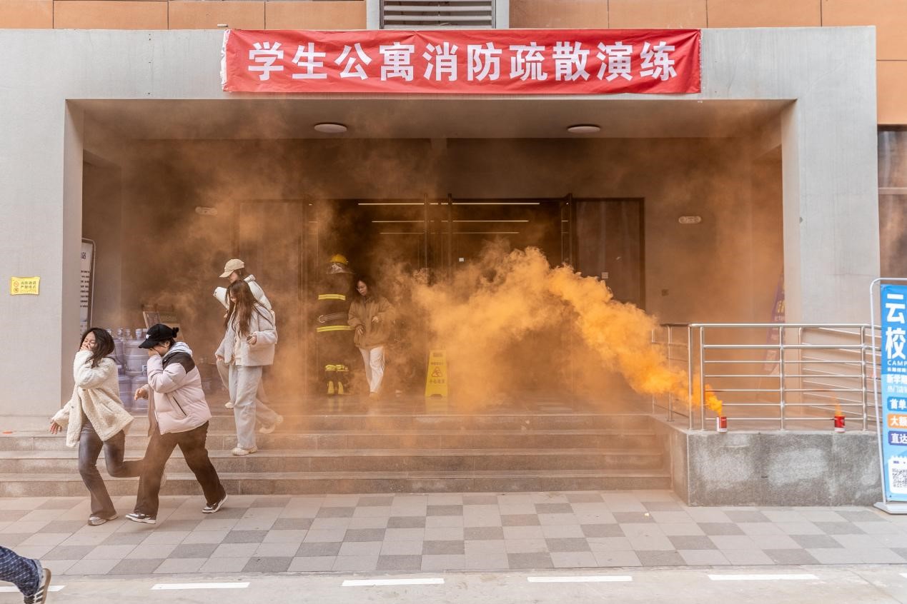 在公寓管理员、辅导员及学生志愿消防员的引导下,楼内近2000名学生在短时间内用湿毛巾捂住口鼻,沿楼梯间弯腰低姿,按照预定的疏散路线快速、有序地向楼外指定安全集合点撤离。整个过程紧张而不慌乱,疏散通道畅通,关键位置均有工作人员指引提醒,防止发生拥挤、踩踏。