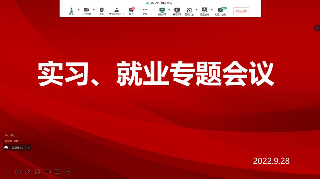 在全球疫情严峻复杂的新形势下,为进一步加强2023届毕业生教育管理,落实学校疫情防控要求,更好地引导学生完成实习及就业工作,高等职业技术学院毕业班辅导员于9月28日在线上召开了实习、就业专题班会。