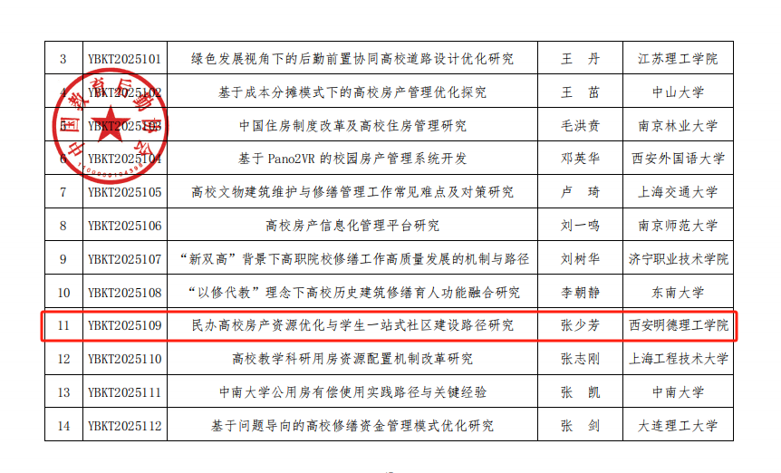 近日,世界杯官网资产管理处申报的研究项目《民办高校房产资源优化与学生一站式社区建设路径研究》成功获得中国教育后勤协会批准立项。