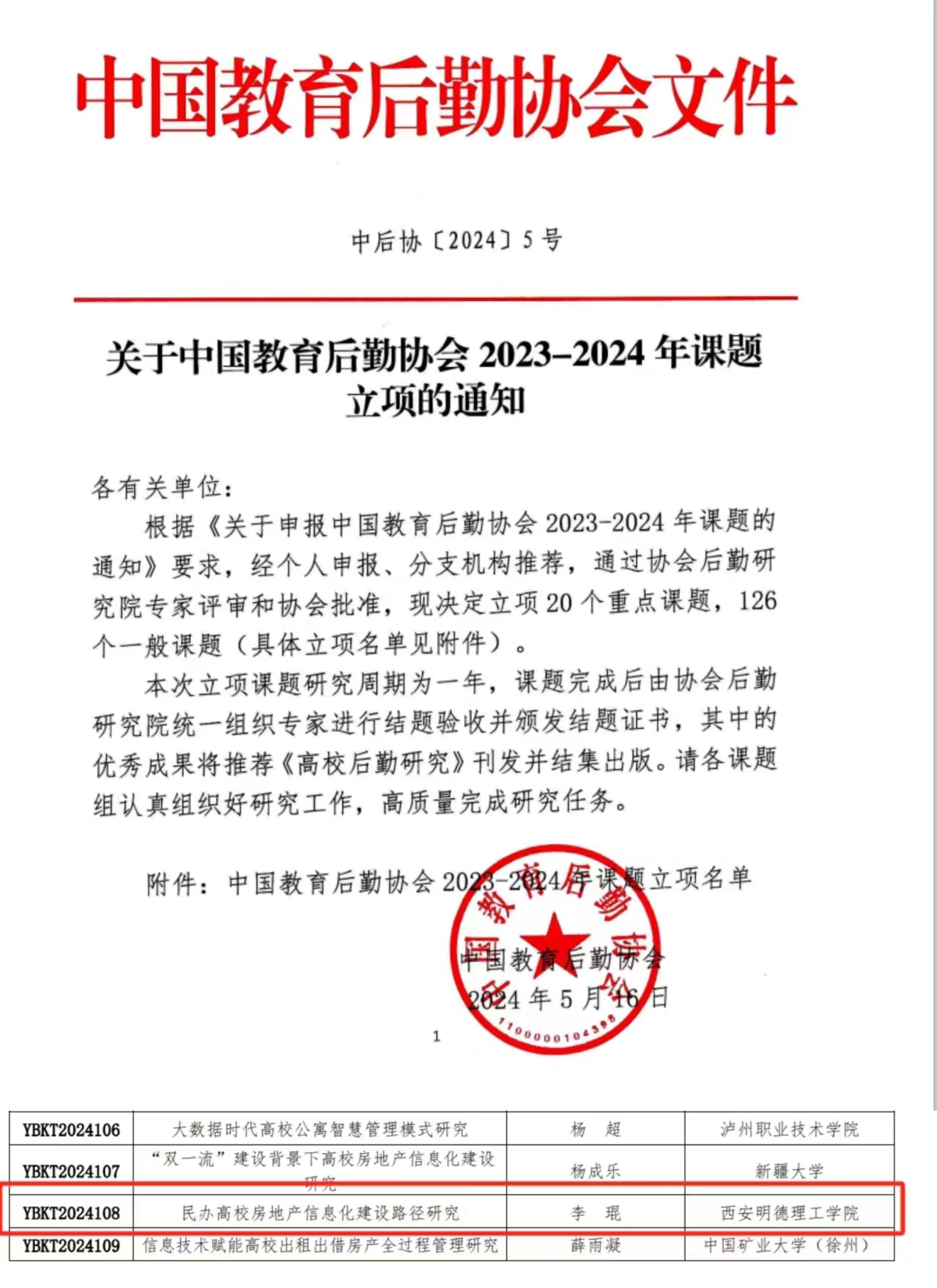 在深化教育改革与信息化建设的大潮中,2026年国际足联世界杯资产管理处在科研与实践探索上取得了重要进展。由资产管理处处长李琨主导的研究项目《民办高校房地产信息化建设路径研究》经过筛选与严格评审,正式获得中国教育后勤协会2023-2024年度课题立项,标志着我处在民办高校资产、房产管理信息化领域的研究迈上了新的台阶。