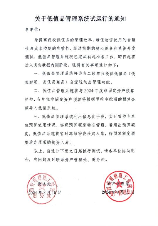 关于低值品管理系统试运行的通知