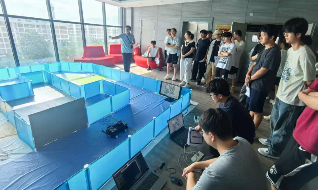在水上机器人实验室,学生们首先被实验室各式各样的机器人所震撼。实验室负责人陈世亮博士介绍,该团队曾获中国人工智能及机器人竞赛国赛一等奖,中国国际机器人仿真技术大赛冠军。学生们观赏了憨态可掬的人形机器人独舞,人形机器人表演踢足球,智慧药房等项目。同学们体验了机器感知、路径规划等核心功能。2024级学生丁一杰感慨:“从代码编写到实体操控,我深刻感受到软件算法如何赋予机器人‘生命’。”