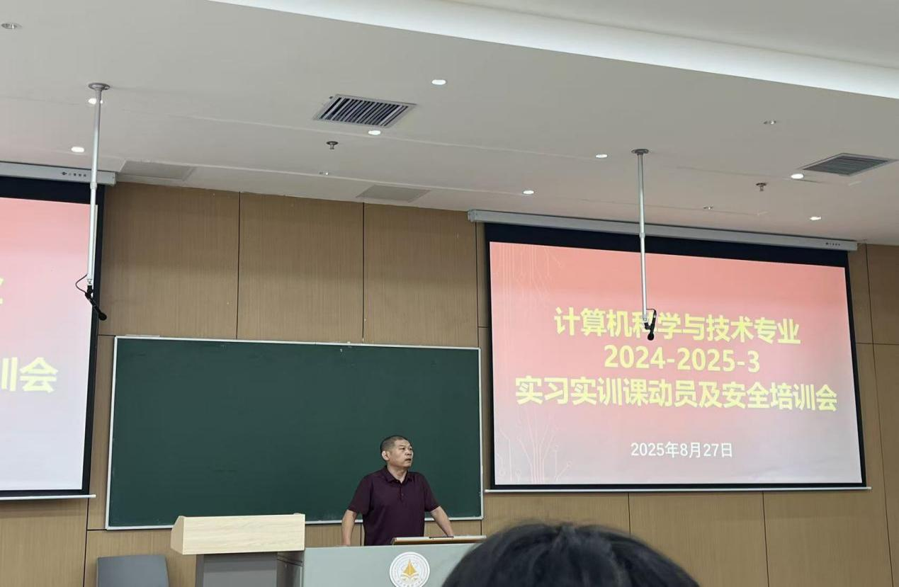 为切实保障 2024-2025 学年第三学期实习实训课程高质量推进,提升教师指导水平,强化学生实习安全管理,2025年8月27日下午,信息工程学院计算机科学与技术专业在7号楼101教室组织召开实习实训课动员及安全培训会。会议由专业负责人蔡现龙主持,计算机科学与技术专业全体教师参会。