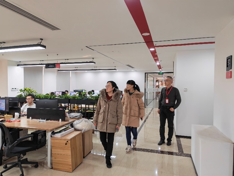 随后,安涛总监带领参观了公司办公区域、创意设计中心及项目实训场地,直观展示企业团队构成与项目运作模式,并结合业务场景,重点分析了当前行业对电子信息类人才的需求标准,强调复合型技术人才的重要性。