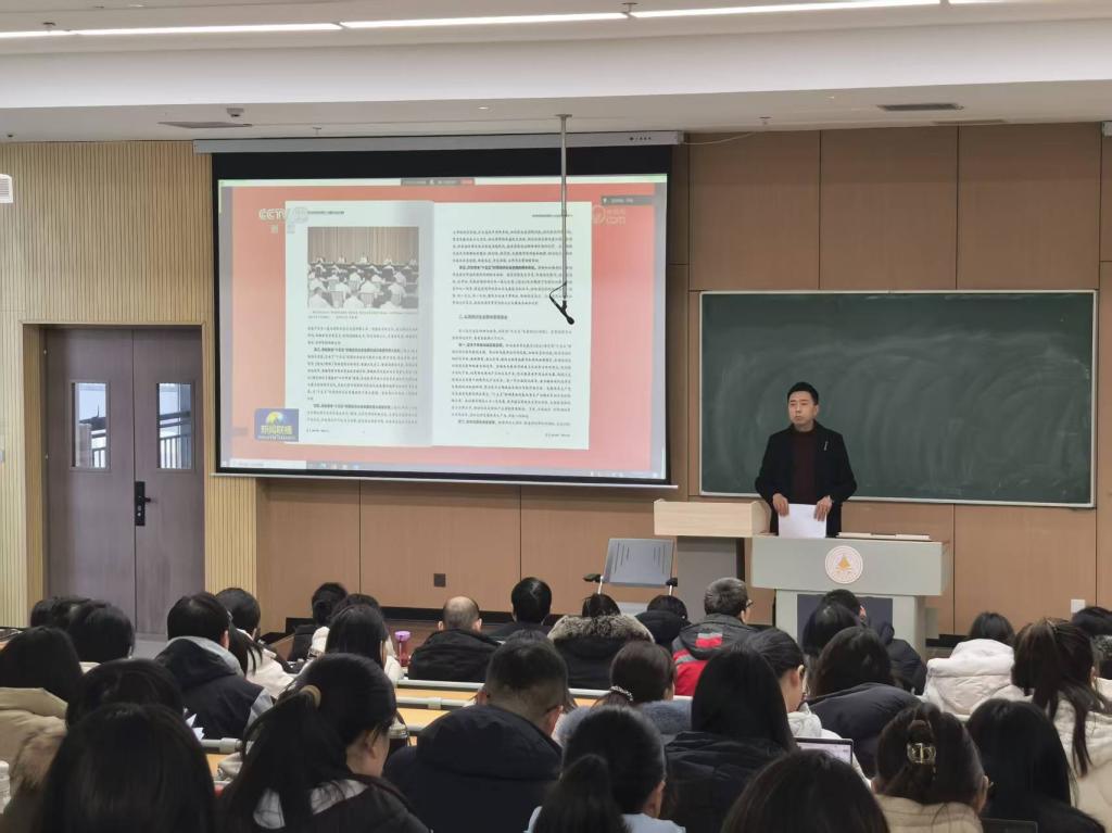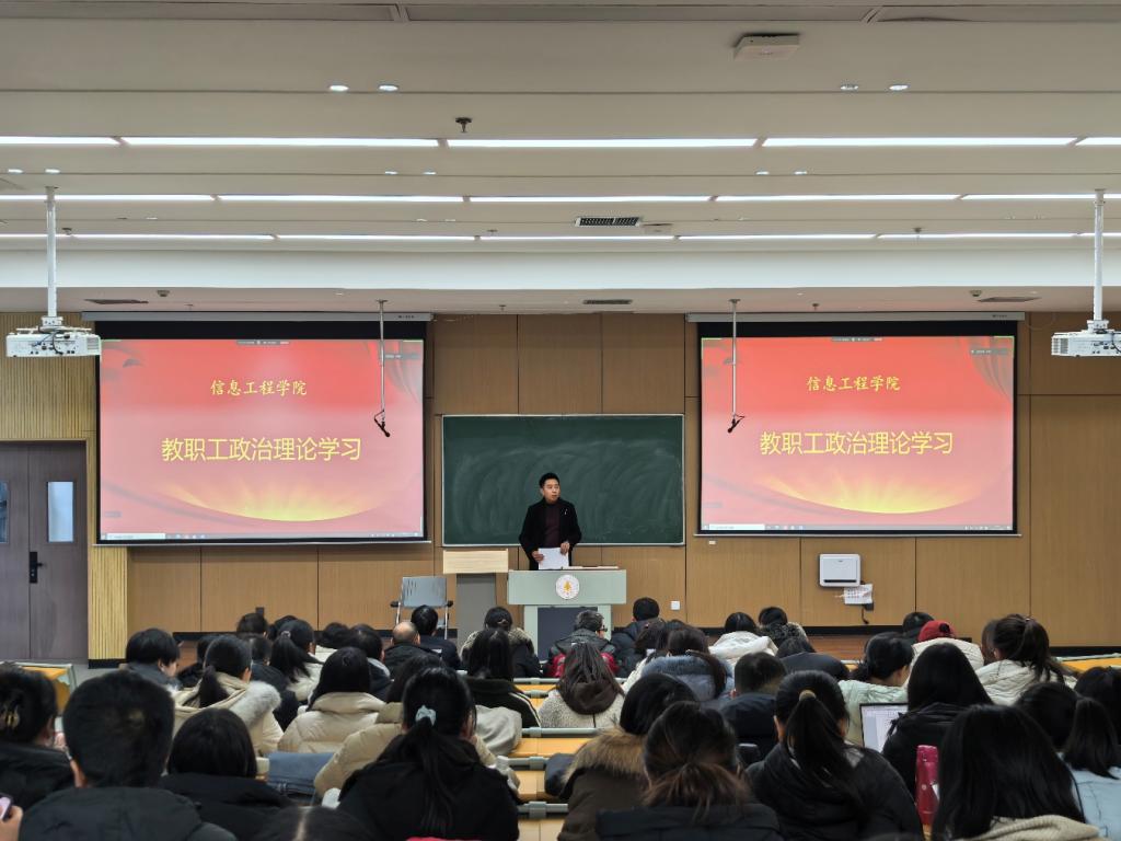 2026年1月9日下午,信息工程学院召开全院教职工大会,专题组织政治理论学习。学院党委副书记高长江主持会议,全体教职工参会,共同收看学习《求是》杂志发表的习近平总书记重要文章《学习好贯彻好党的二十届四中全会精神》。