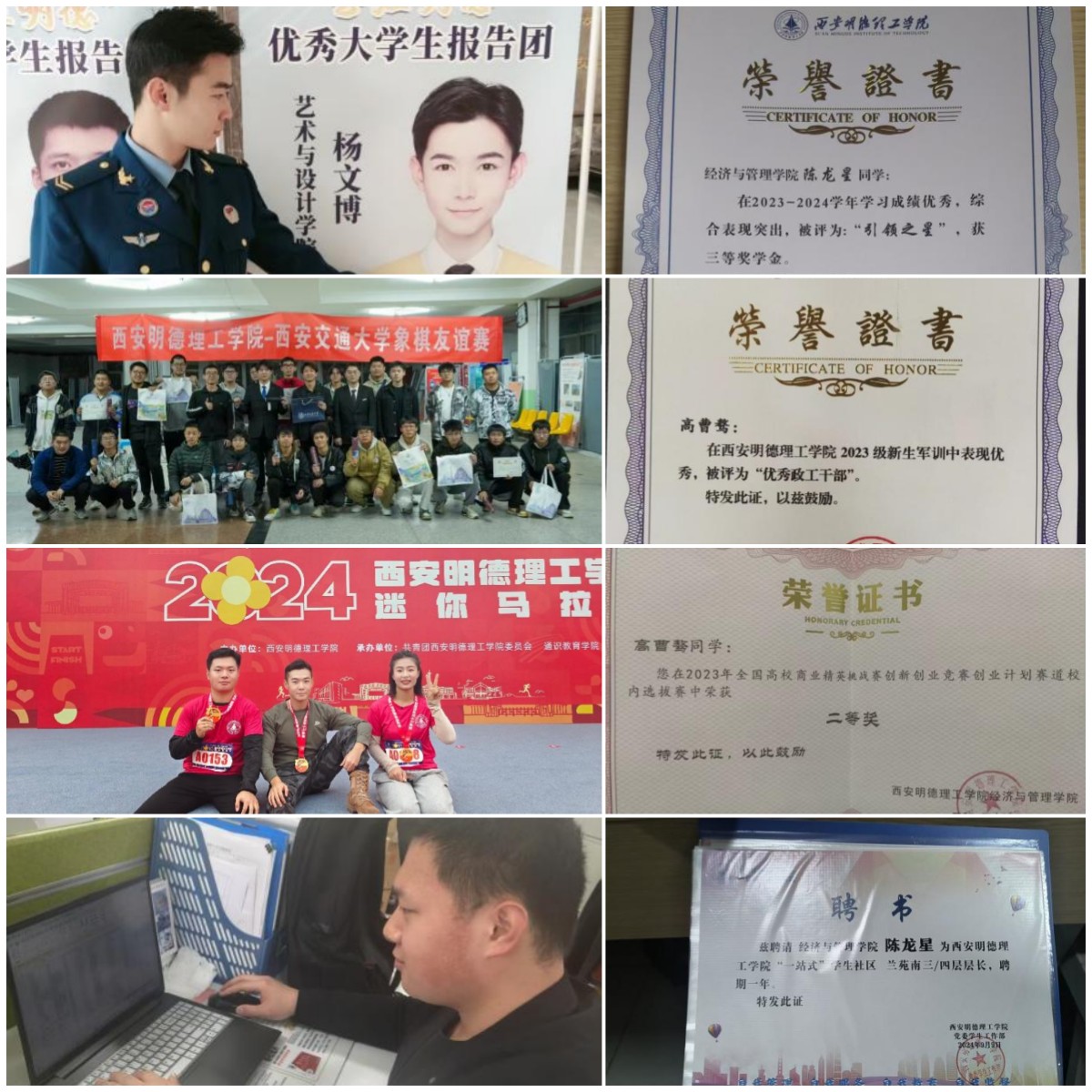军旅生涯,在他们身上刻下了深刻的烙印。优良校风,让他们在学业上勇攀高峰。高曹骜,火箭军部队走出的铁血战士,服役期间考取多项技能证书,退役后将军营的严谨作风带入校园,在学科竞赛中屡获佳绩,即将成为陕西师范大学的研究生;张瞻,战略支援部队的战士,曾参与国家航天卫星发射保障任务30余次,退役后斩获陕西省数学建模竞赛省二等奖等多项荣誉,今年成功考取西安工业大学研究生;陈龙星,中央警卫团的铁血卫士,退役后凭借过硬的素质和不懈的努力,成功入职陕西盘龙药业集团股份有限公司;杨文博,空军部队的“四有”优秀士兵,复学后不仅学业优异,还担任退伍军人戎耀社团社长,将军人的荣誉感转化为服务同学的热情。