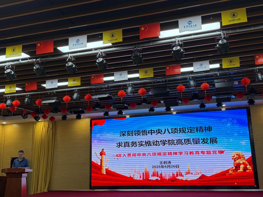 为推动深入贯彻中央八项规定精神学习教育走深走实,进一步转变工作作风,以教育家精神涵养师德师风,求真务实、担当作为,为学校高质量发展和教学评建工作贡献力量。马克思主义学院与通识教育学院党委于6月26日上午在建德楼203报告厅召开深入贯彻中央八项规定精神学习教育专题党课。此次党课以“深刻领悟中央八项规定精神 求真务实推动学院高质量发展”为主题,由党委书记王君涛主讲,全体教职工参会学习。