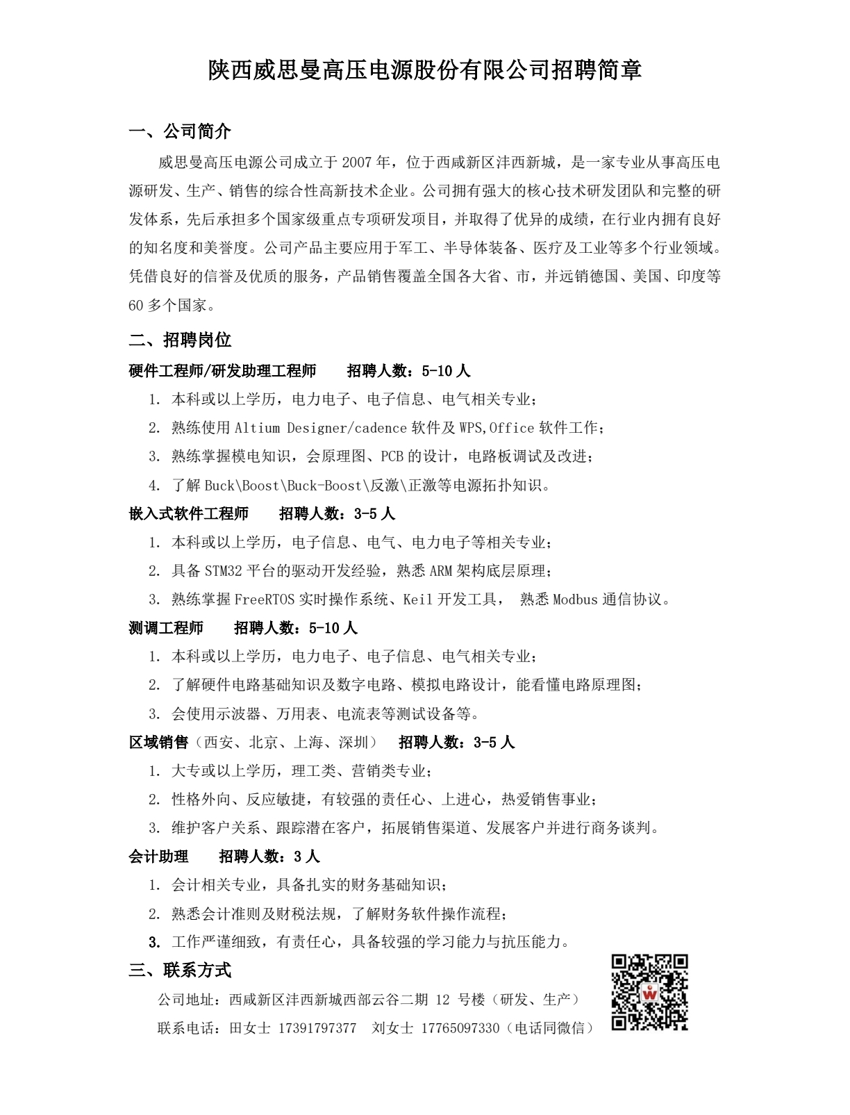 陕西威思曼高压电源股份有限公司招聘简章