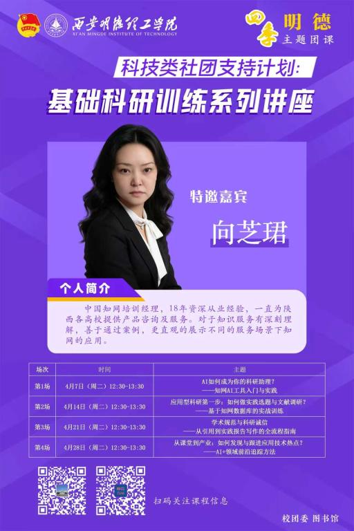 4月7日,由学校团委与图书馆联合举办的“四季明德”主题团课——科技类社团支持计划基础科...